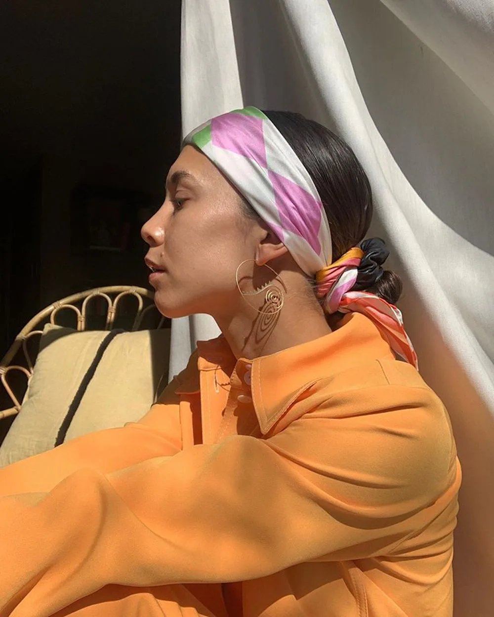 Embrace summer weather by opting for a colorful look made of mixed materials. Contrast the high saturation with a simple black clog and minimal jewelry.