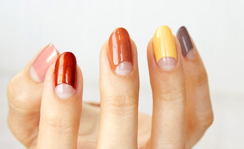 Saunders used five shades to complete this on-trend muted rainbow look: Home Grown, Rust Worthy, On The Bright Cider, Hay There, and Easily Suede. "Start with clean nails. To create negative space use an oval clean-up brush dipped in polish remover to carve out moon shapes with each nail color," manicurist Michelle Saunders tells The Zoe Report over email. "A pro tip is to add Here To Stay Base Coat over entire nail after nail color then finish with Speed Setter Top Coat."