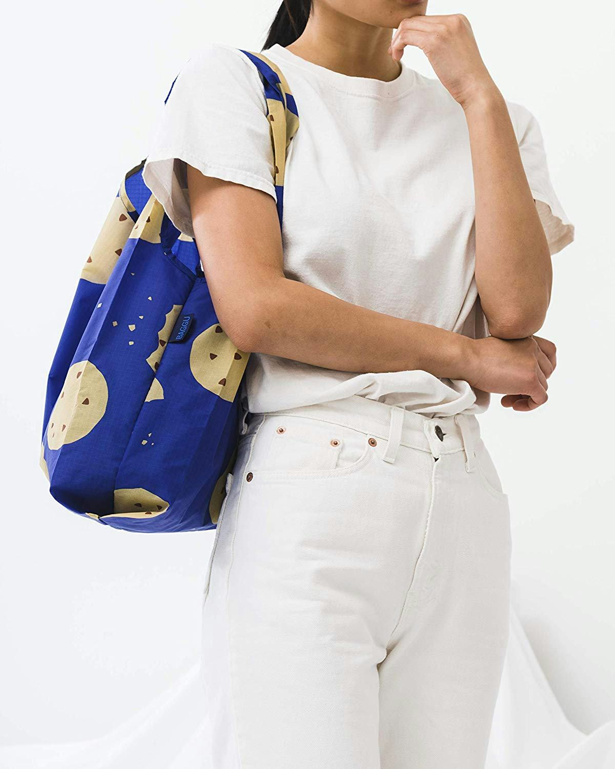 This reusable shopping bag can hold a ton of groceries, but it folds up into a compact square so you can stash it in your purse. The handles are short enough to hold in your hands, but long enough to sling over your shoulder. Made from rip-stop nylon, the bag is sturdy enough to hold up to 50 pounds. Chose from floral designs, sailor stripes, basic black, or colors like cotton candy and terra cotta.