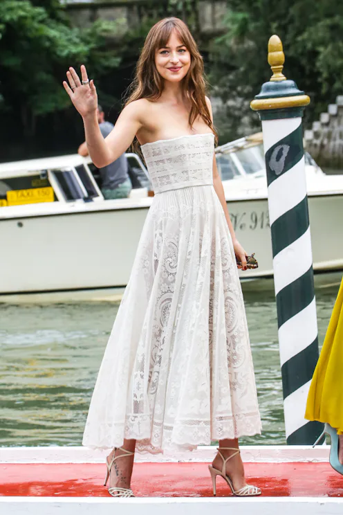 That said, naturally, it's a mixed bag. Whether you're talking about Johnson's dressed-up days (pinstriped suits) or her casual, here-to-there attire (jeans and Dad sneakers), the answer is likely to be different. For the former, Jennifer Lawrence is a perfect match, even incorporating flirty lingerie pieces underneath like Johnson did, for a total bedroom-to-boardroom look. For leisurely outfits, Emma Roberts is a veritable source of likeminded inspiration. In one look, the actors even went as far as choosing outerwear pieces in the same print, and loafers from the same luxe fashion label. Hint: Johnson plays brand muse to it.