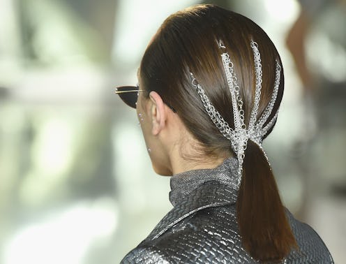 Who says that Advil is the only way to cure your high ponytail-induced headache? All throughout fashion week, models wore the style so many different ways: Justine Marjan aimed for an elegant vibe at Cushnie, with a sleek center part and shine. And at Christian Siriano, she edged things up by adding actual chains to the models' hairstyles, secretly wrapped around a concealed bungee cord.