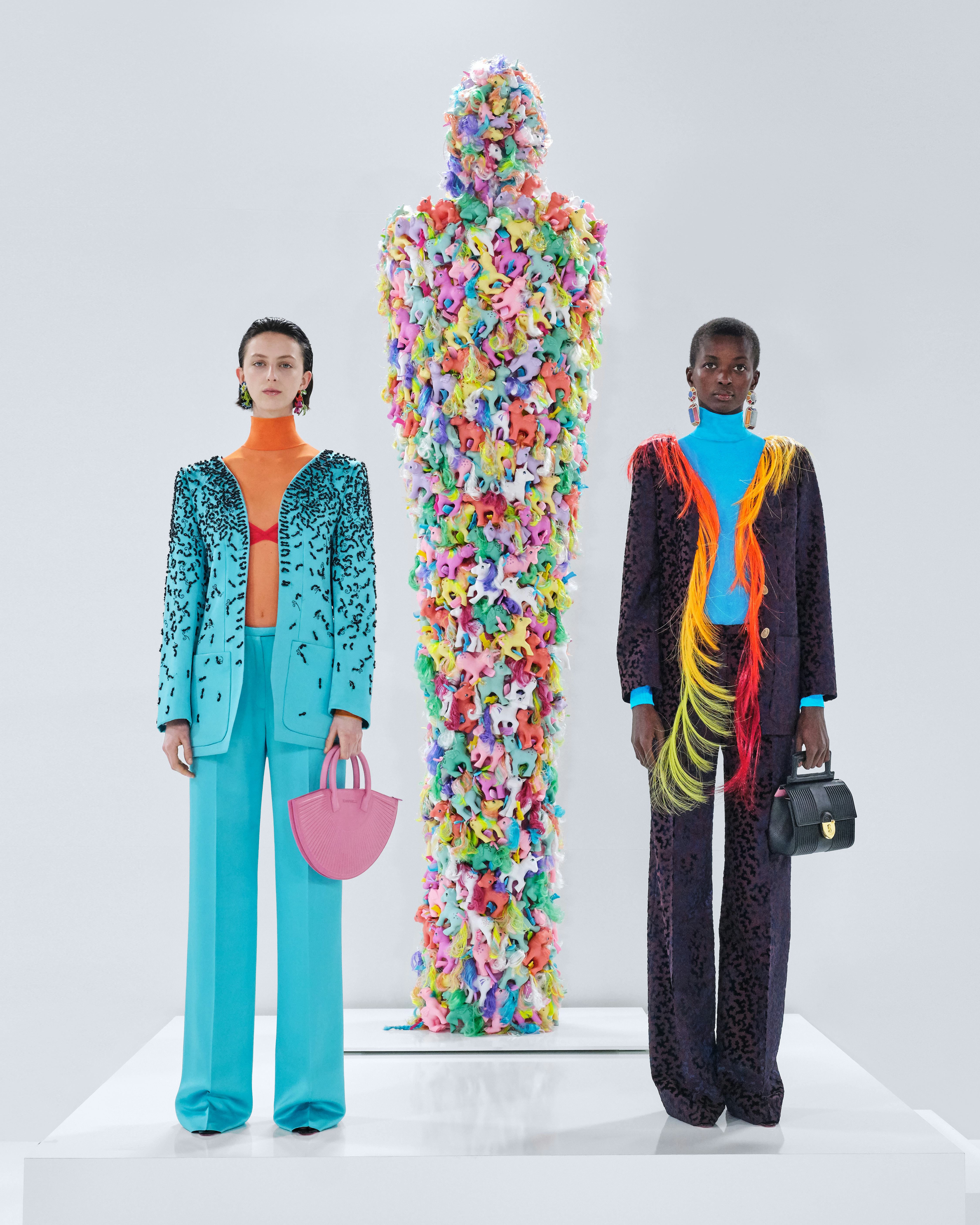 Grandiose jewelry designs stole the show for many, but the apparel warrants a second look at Daniel Roseberry’s first Spring collection as the house’s Creative Director. Schiaparelli’s returned to the runway as a couture house in 2014 after a 60 year hiatus, translating couture elements into their more retail friendly Ready-to-Wear collections as well. Think floor-length sheer sleeves; gold, lash-like eye adornments; and dramatic feathering. While animal prints are currently trending, Roseberry approaches the cow print differently than expected: The collection features an asymmetrical leather dress composed of only two large cow spots, versus an all-over print. The collection screams “reinvention of the ordinary,” possibly a foreshadowing of Roseberry’s work to come.