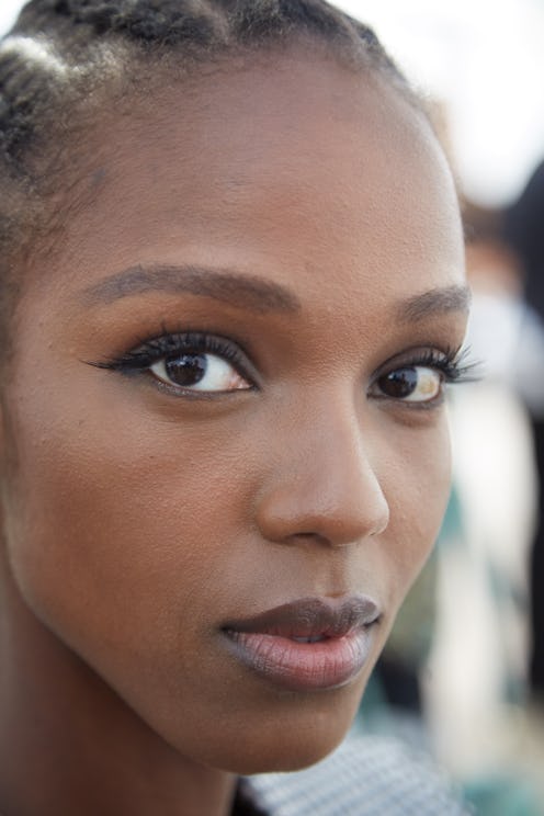 Lest you think the strong eye and nude lips from the Giorgio Armani runway are basic, you should know that the extended cat-eye comes courtesy of strategically-placed falsies. “False lashes were applied to extend well past the outer corner of the eye and then blended with the Armani Beauty Smooth Silk Eye Pencil, creating a cat-eye effect that added some drama to the minimal makeup look,” the fashion house said in a press release. Cantello complemented the lashes and liner with matte skin (via Giorgio Armani Beauty Power Fabric Foundation) and nude lips (using Lip Maestro Freeze in Nuda).