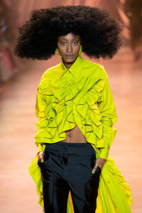 "The unexpected colors I am loving for fall are the tones of yellow including soft butter yellow and a sorbet-like yellow-orange," Eke notes. Many shades of yellow were shown by designers during Fall/Winter 2020 fashion month. For instance, Christopher John Rogers showed both a rich (above) and neon yellow (similar to Pantone's Green Sheen on the trend report). While Molly Goddard displayed the hue in a soft buttery tone, like Eke notes above.