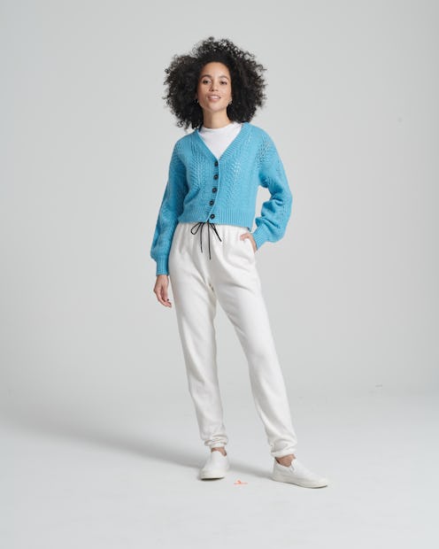 Launching on Feb 3, the collection includes a series of intentional pieces, available in different styles and colors. The Long Cardigan Dress in Toffee offers a silhouette similar to your ankle-length winter puffer. Styling options are numerous — the piece can be worn unbuttoned over a dress or jeans; or, button up and wear as a dress with a chic belt. The lace crew pullover, which comes in Apricot, Avocado and Lilac, offers a more textured knit that's made for pairing with your favorite denim (overalls, jeans, and miniskirts encouraged).