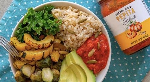 Nothing like a wholesome, veggie-filled bowl of goodness. Enter this super-simple combo of frozen brown rice, pre-chopped kale, and a bag of frozen Roasted Brussels Sprouts & Roasted Delicata Squash, but the cherry on top is the TJ's Pepita Salsa. Find the full details here.