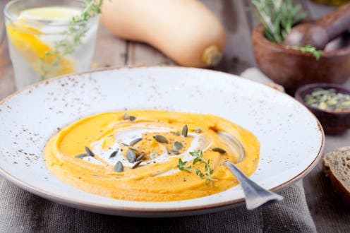 When squash in is season (and therefore extra flavorful), you don't need to do much to it to create an awesomely autumnal dish, like a pureed soup — and Self offers a hack to make it as simple as possible. "Grab some precooked or frozen squash like butternut or kabocha, and blend it with a little chicken broth and milk (dairy or non-dairy)," she suggests. "Warm it up on the stove with spices like sage or oregano and you've just made super easy and healthy squash soup!"