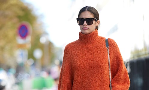 Sampaio tried out the trend during Paris Fashion Week. Much like her fellow Victoria's Secret model, Sampaio opted for an orange turtleneck sweater dress. She paired the bulky knit with olive-green ankle boots and a matching crossbody bag. Sampaio topped off the look with a sleek bun and vintage-inspired sunglasses.