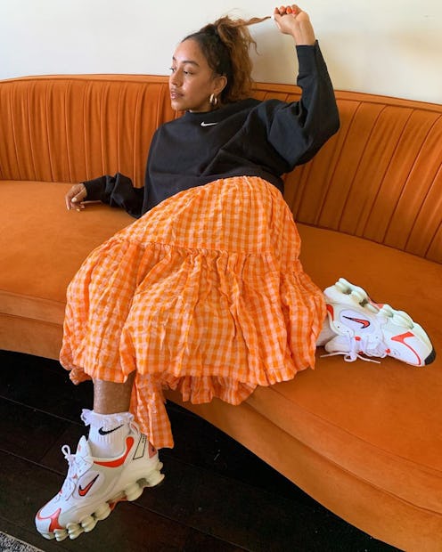 Stylist Peju Famojure says in summer 2019 she saw women influenced by men, and incorporating the rebellious skater subculture trend by wearing bike shorts, bucket hats, and ironic florals usually worn by dads on vacation. But for this summer, she's seeing different types of rebellious fashion choices emerging. "First is conscious clothing and making a statement with your dollars," Famojure explains. "Second are the subtle flashes of skin in barely-there sheer options with cool graphics, or alluring and experimental cut outs."