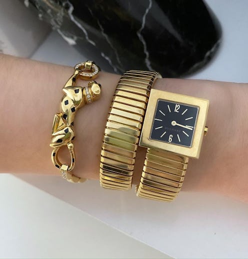 As rich and thickset '70s-style jewelry continues to trend, Heller says serpent watches are a big part of the comeback. “Serpent watches were popularized in the 1940s when Bulgari came out with their first Serpenti watch but became fashionable in the ’60s when Elizabeth Taylor was photographed wearing an ornate gold and diamond design by the house on the set of Cleopatra,” Heller explains. “The image of her wearing the watch is what really put Bulgari on the map.”