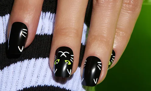 And sure, you can go the subtle route and buy press-ons in a Halloween-esque color, like pumpkin orange, or a nice, witchy purple; and that's a smart choice if you plan on investing in a boutique nail set that runs higher than the average drugstore kit. But with press-ons you can pop off the next day, why not go all out? Below, nine designs that'll complete your costume — or just look cute while you eat candy on your couch.