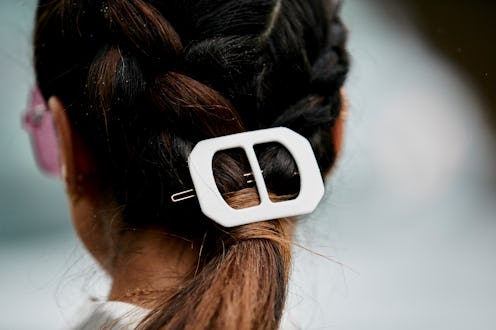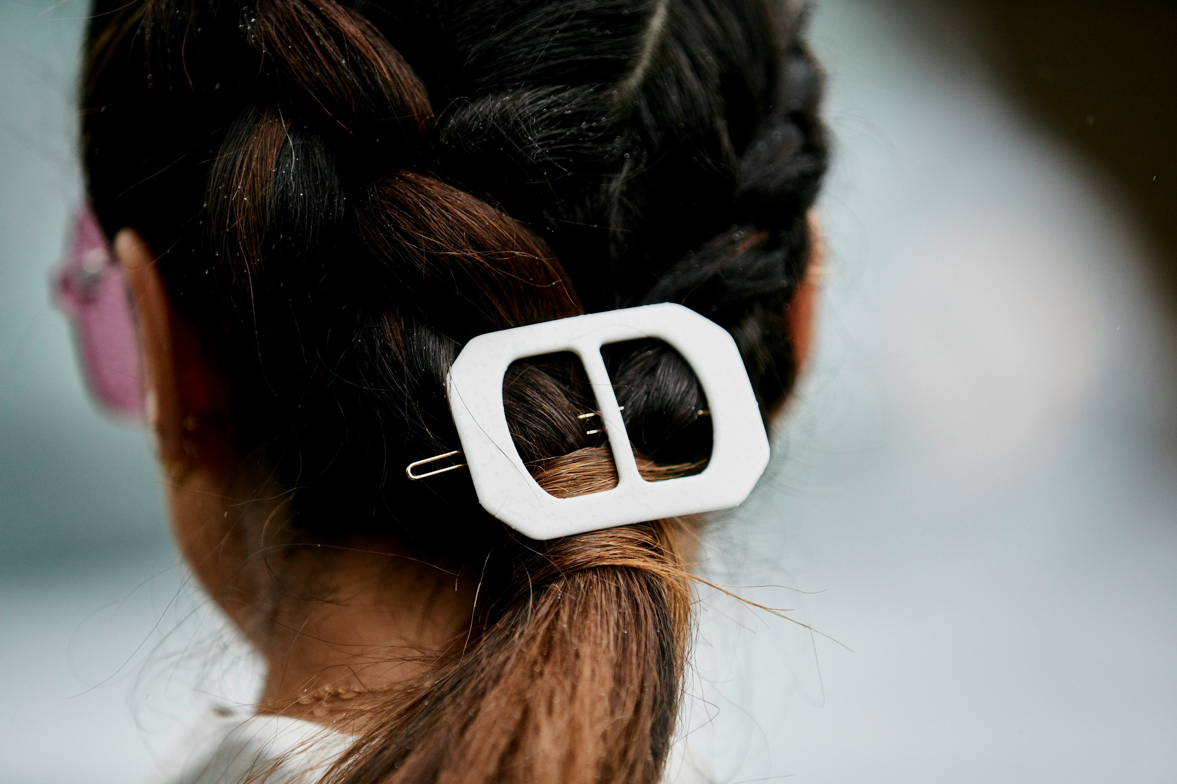 An attendee clipped on a stylish white enamel hair accessory right above the base of her updo. To prevent your bauble from slipping, try spraying the clip with a bit of dry shampoo.