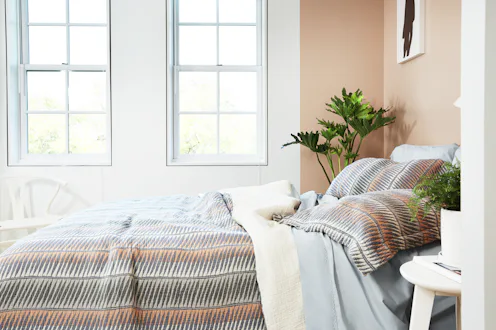 Cover your mattress in a set of the brand's new 100-percent cotton sheet selections — either Garment Wash Percale or Organic Sateen, both of which are available in white and subtle muted shades like light blue, gray, and blush that'll go with any design aesthetic. The percale sheets go for just $98 in queen size, while the sateen set retails at $128. You can even get all-new pillows at just $19 a piece for Allswell's new standard Down Alt Pillow. Top the sheets with one of the brand's chic new duvet sets (like this feather-stripe style starting at $195) and add a luxe throw blanket for added coziness.