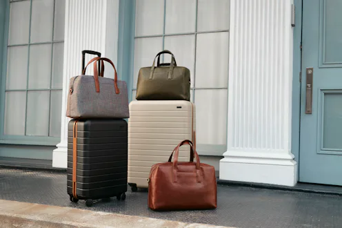 If you're in the market for a new suitcase, you'll find that Away's luggage sizes — The Carry-On ($275), The Bigger Carry-On ($295), The Medium ($325), and The Large ($345) — are all available in both a shade of sand and black that have been trimmed in premium tan leather. Meanwhile, if you're lacking a carry-all that can slip right onto your suitcase handle, be sure to peek at The Everywhere Bag while it's up for grabs in both a smooth, warm brown leather and green leather for $325 as well as in a classic plaid with dark brown leather trim for $275.