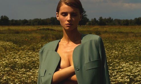 Look to the Ukrainian line's fall drops for more on-trend seasonal essentials too, like new takes on suiting in this olive jacket and olive pants duo, complete with unexpected style elements that'll help you stand out at the office. Layer a turtleneck underneath to keep warm, while maintaining a streamlined vibe. Or, go the moody floral route with this printed dress, paired with some boldly hued tights and Bevza's aforementioned loafers.