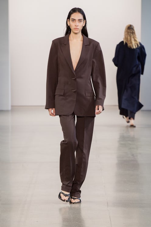 That might explain why some of the bolder colors she uses in this collection felt like a real risk. ("That was so bold for me. I never do colors!" she tells TZR.) Can muddy browns and bright aquas withstand the test of time? In the right renditions, this show proved, they can. A midi-length turquoise knit layered over slightly-baggy brownish trousers felt timeless despite the funky color palette (and despite the heeled flip-flops). A feat indeed.