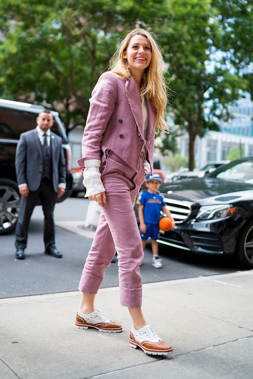 While you've been spending the last few weeks of summer in your typical warm-weather uniform (think: breezy skirts and lightweight dresses), Blake Lively has been wearing suits. The A Simple Favor actor has walked the sweaty streets of New York City in not one, not two, but six pantsuits. And while a matching suit may feel like a risk, a close look at Lively's best looks prove there's a good reason she's relied on the formula so heavily: Suits are an easy, streamlined outfit worth transitioning into fall.