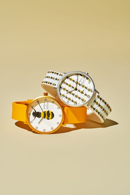 In step with the "Honey" prints displayed in the bee portion of the collection, Helmstedt and Skagen built two models — one features a singular bee on its face, with a marigold band and hardware, the other one step bolder, dressed from end to end in a swarm of bees and polished off with pearly white hardware.
