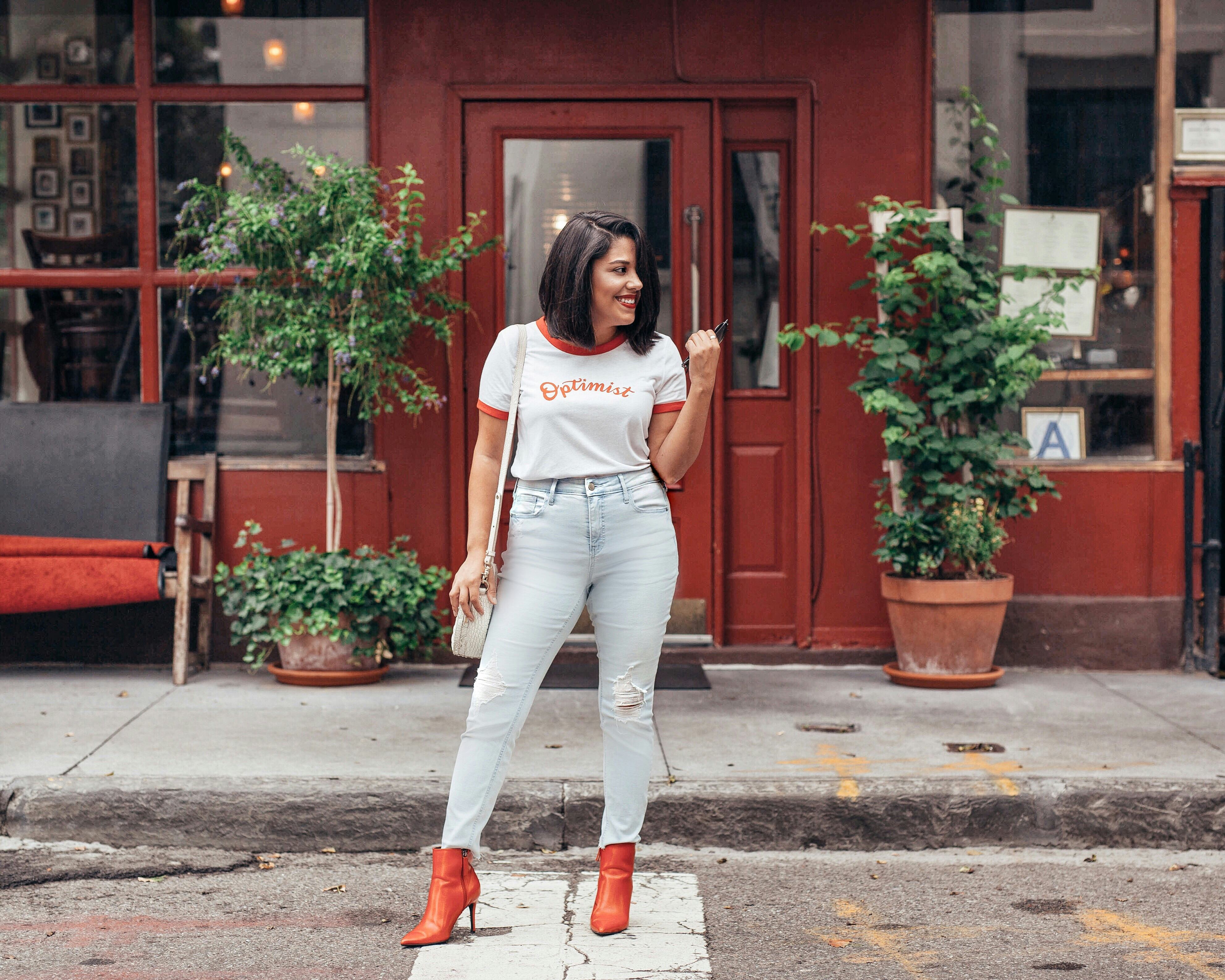 For her, a crucial part of shopping for denim is a flawless fit for her four-foot, eleven-inch frame. “An amazing outfit always helps to lift my spirits,” says Naty. “You can be wearing the simplest thing, but when you feel great wearing it, your entire look is elevated.” Old Navy's Rockstar Jean not only comes in petite, but the sewn-in Secret-Slim pockets also ensure a smooth silhouette from A.M. to P.M., making them a no-brainer for confidence-boosting style.