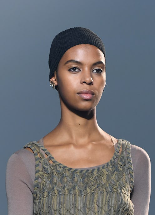 “Every model has different headbands on, very thick, all inspired by movement," Palau tells The Zoe Report. “We’re wrapping the hair around the head, creating a fold in the back in a design. It’s very beautiful within itself without any lumps or bumps or knots. It’s much more of a simple silhouette when you see it. Even though it’s subtle, the hair would look very different if we pulled it back into a chignon — this look feels more experimental but still feminine.”