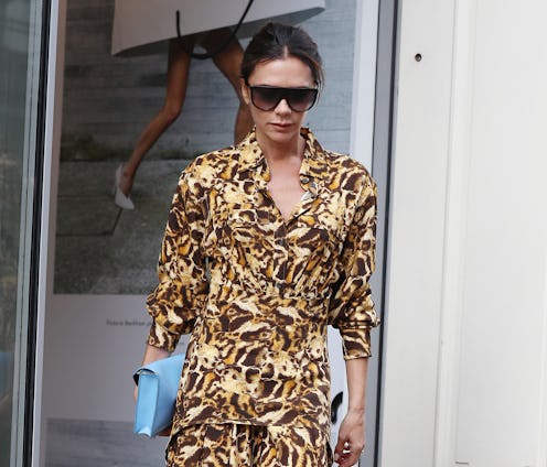 Designer, former pop star, and British fashion icon Victoria Beckham was photographed wearing a printed version of the trend. She paired the long-line shirt dress with pastel-blue pumps and a matching bag.