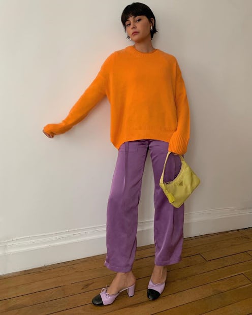 This year, instead of the typical deep autumnal hues, bold pigments are dominating, offering an exciting new approach to cold-weather dressing. Some of the flowery colors you might typically wear in the spring and summer, like lilac and light yellow, are now fair game for the colder months. Looking back to the Fall/Winter 2019 runways, you'll see exactly how these vivid colors made their way to the popular app. Sies Marjan's collection was a rainbow of ready to wear, JW Anderson incorporated bold pops of bright yellow, and even minimalist favorite Sally Lapointe showed a head-toe-toe lavender snake print ensemble.