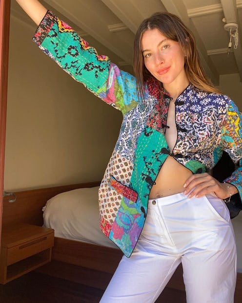 "I think bohemian fabrics are slowly making a comeback in fashion, there is a handmade quality to patchwork that one can appreciate," Lucy Akin, designer of Ciao Lucia, tells TZR. Akin was inspired by the Laurel Canyon when creating her California-based brand's patchwork pieces, and says they have a nostalgic '70s feel to them. "When I discovered the fabric, I started drooling over it immediately and knew I had to make something with it! We had the pant and jacket already developed and my gut told me we had to make a matching set." Los Angeles influencer Courtney Trop of @alwaysjudging, a friend of Akin's, has been wearing the Pietro Pant Patchwork styled with a bikini top (above). "We’ve had customers in colder places pairing the jacket back to a great pair of vintage jeans," Akin says.