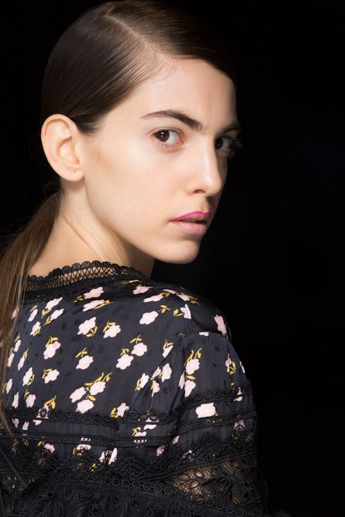 Marjan gave Alice + Olivia's models whimsical, purposely messy knotted up 'dos to go with the feel of the collection. "It's a really clean center part to start," she tells TZR backstage. "With TREsemmé Compressed Micro-Mist Hair Spray Hold Level 1: Texture at the root for lots of movement at the top."