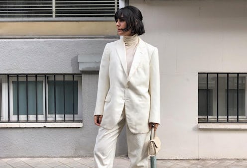Skip the pumps and next time accessorize a suit with sand-colored boots. If it's particularly cold outside layer a turtleneck underneath. Too add a little texture and an outdoorsy appeal, go with shearling-lined hiker boots.