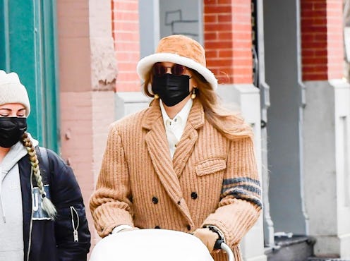 In recent weeks, the new mom has been spotted strolling through Manhattan many times, always in severely low-key looks (hat, frames, and mask included) that are primed for flying under the radar. On Dec. 19, her look of choice featured all the above, as well as some extra-warm items made for braving the low temps. For her hat, she chose a logomaniac-worthy shearling bucket hat, stamped lightly with Louis Vuitton's monogram. Then came Thom Browne's corduroy blanket coat, with leg-climbing slits made for wearing out or lounging on the couch in. Underneath, she buttoned a white Oxford shirt all the way, and tied in a pair of light-wash blue jeans with a straight-leg bootcut. Then came the combat boots: Dr Martens' iconic 1460 silhouette in a tanned, distressed leather.
