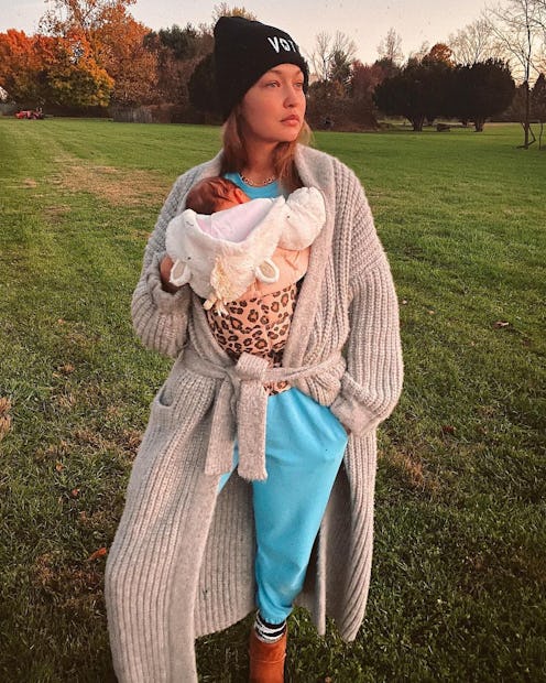 For the duration of her pregnancy, Gigi Hadid's public appearances were few and far in between. The closest fans got to seeing her maternity style was through her Instagram, where glossy photoshoots and cheeky at-home selfies reigned supreme. As the world eagerly awaits a first look at her and Zayn's baby girl, Gigi Hadid's offering something else — a street style outfit that new moms everywhere can (and should!) try themselves. Her sister Bella's outfit scores an honorable mention, offering a great outfit idea for all the aunts out there helping with newborn duties.