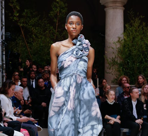 Instead of the colors that might initially come to mind for this "Earth" theme — an array of browns, beiges, greens, and yellows, that is — Armani’s line featured a palette of pastels in pink, blue, and gray. It was a softer interpretation of the theme in floaty fabrics and silhouettes that may remind the spectator of nature by way of multihued skylines, calm waters, and, in more literal ways, lush leaves that were also seen in prints across the collection's range of designs. It's an embrace of the romantic airiness that comes with finally being able to break out a dress again, to finally be able to trade heavy-duty boots for something more carefree.