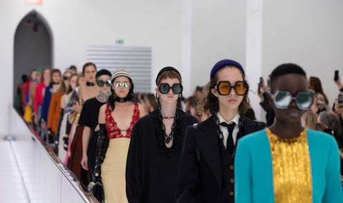 Bucking the notion that good things don't last long, Gucci designer Alessandro Michele proved he still has the magic touch. Michele has garnered a cult-like following throughout his five-year reign at the storied Italian fashion house, and this season in Milan he unveiled his Spring/Summer 2020 Gucci collection to a sea of eccentrically dressed attendees including the likes of Jared Leto, Iggy Pop, and A$AP Rocky. Prior to any of the anxiously awaited glitzy, maximalist creations that Michele's known for even hit the runway, however, he sent a sea of somber models down a conveyor belt dressed in all-white canvas garb, which decidedly resembled straight jackets. In the show notes, Michele nodded to the writings of Foucault, suggesting that fashion is meant to eschew societal control, and stand for freedom and resistance. Once those 60 some-odd individuals passed through the moving runway, the mood shifted and in marched a new wave of Gucci.