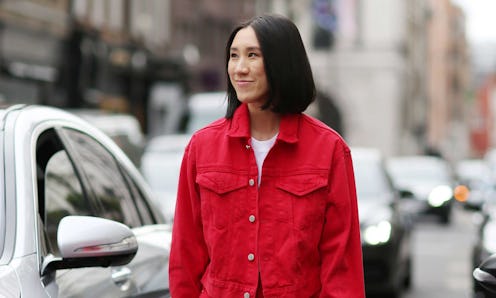 Unless you're being carted around the city in a private car (and if so, lucky you) a pair of sensible shoes is a non-negotiable. This doesn't mean you can't let your personal style shine through, though. Instagram's Eva Chen shows how a matching set in a bright shade of red looks well-suited with city loafers.