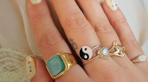 The best part about wearing rings on all of your fingers is that the styles you pick out of your jewelry box can steer you towards different moods and aesthetics. If you're feeling romantic opt for pearls and diamonds. Going for something more eccentric? Add in a mood ring and maybe some moonstone. And for a minimalist vibe, grab some cool signet rings and chunky styles and stack 'em up. You get the idea: It's very versatile and very fun. Ahead, see how Instagram's most inspiring influencers are tackling the horizontal ring stacking trend and shop the picks to test drive each of the formulas.