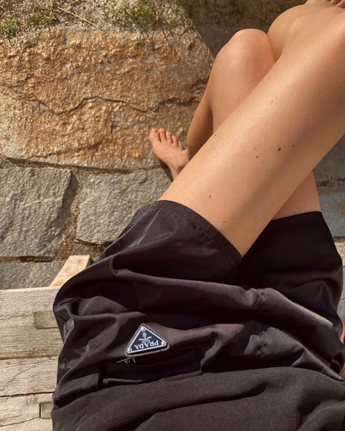 Whether you opt for a Prada nylon running short or cut-off sweats, Stewart says to lean into athleticism when styling your go-to sport short. "I like to commit to the sporty look and pair mine with a sweater or tank top, tube socks, and chunky trainers. You could also add small gold hoop earrings and a baguette bag for a more feminine feel."