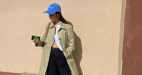 All hail trench coat season. Add on a baseball hat to your fall trench coat and sneaker uniform to give it a sporty twist.