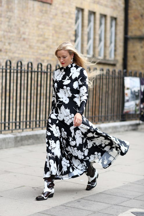Yasmin Sewell's ever-so-cool check-printed dress is taken up a notch thanks to a pair of strategically accessorized sock booties that skim the hemline of her frock. (The below is technically a blouse and skirt but they're a matching set, so it totally counts.)