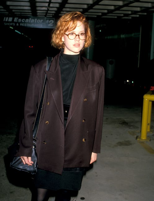 Chief among all '80s trends was the velvet blazer, which Ringwald doubled-down on with an equally-soft cowl neck dress in deep green. Her smooth leather handbag proves that she could totally be a LOEWE fan, today.