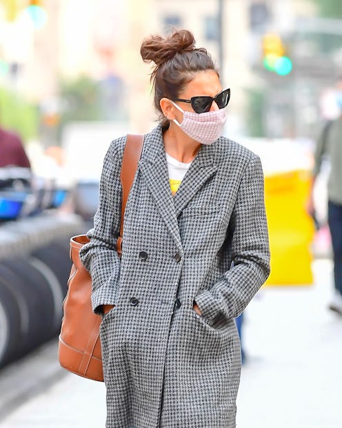 The 41-year-old actress is frequently spotted spending quality time with her new beau, Emilio Vitolo Jr. in New York City as of late, and on November 3, she stepped out with the celebrity chef in an ensemble that was equal parts comfy and chic. As New Yorkers' reach the point where layering for warmth is no longer an option, Holmes paired her Evolvetogether face mask with a cozy-looking mustard hoodie, worn under a camel-colored Nanushka wool coat. Continuing the "effortless, but make it fashion" approach, Holmes' black combat boots were rather understated, but she topped them off with exposed socks for an added flair.