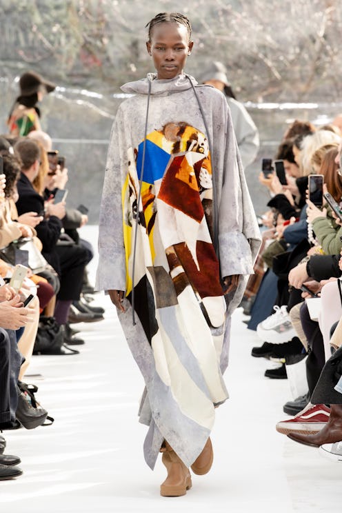 Once guests took their seats inside the translucent tent, a slew of co-ed models walked down the runway in oversized utilitarian jackets, hooded dresses, and long sweater sets. There was a distinct nomadic vibe to the collection, which founder Kenzo Takada built the brand on. In the 1970s, the Japanese native came to Paris and used his travel inspirations found from his trips around the world as the biggest inspiration for his work. “Traveling gave me a lot of inspiration," Takada recently told CNN. In the 1970s, when I was traveling, it was not like it is today. There was much more of a cultural gap when you were traveling from one country to the next, so that really drove me and gave me a lot of influence and inspiration to work on different things around my trips.”