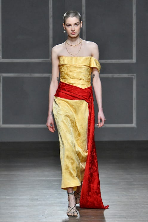 Bright yellow really shines during the summer months, but consider transitioning the color into fall, too. Sies Marjan displayed the hue on a crocodile coat and matching high-knee boots, and Christopher John Rogers showed a three-toned yellow suit that'll rival any all-black look. At Vera Wang, a more muted iteration of the color was exhibited on a sheer top that included a train. Influencer Courtney Trop got in on the color trend, too.