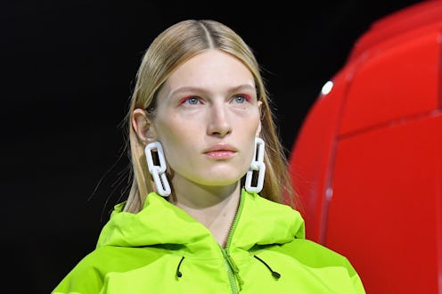 While the rest of the face was subdued, select girls wore a shock of fluorescent pink mascara, fanned out from the middle of the lash to the corner... because this is Off-White, after all, and you can't shy away from making some sort of statement. "The thing with Virgil and Off-White is that we let the girls speak for themselves," she says. "We always give them a little detail — something fun — but want to find something that makes everyone look elegant, chic, and upgraded. We didn't want to go too crazy. It's really just about the clothes and the girl."