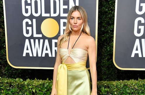"Sienna always looks like she just breezed in from Ibiza. Her bohemian hair and clean makeup keep this citrus Gucci gown from looking fussy."