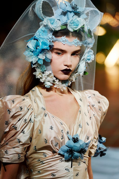 Since Odile Gilbert (for TRESemmé) was working with live flowers and netted veils, she didn't want the waves to look too well-done. "She's a vampire," the hairstylist explains, working through a model's hair with the ghd Curve Classic Wave Wand. Before creating the top knot, Gilbert parted the models' hair in the middle and secured the bun with bobby pins. For the girls who weren't wearing a veil, she opted to make the hair flat as possible... very Wednesday Addams.