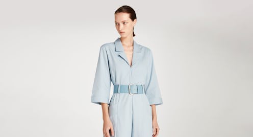 Begin by taking a peek at the $145 Simo Jumpsuit in a baby blue hue. The sleek style's clean design is accented with a monochromatic leather belt featuring a silver buckle. When the cooler weather rolls in, layer a turtleneck underneath in a shade of berry or burgundy to play off the pastel and give it a sartorial spin.