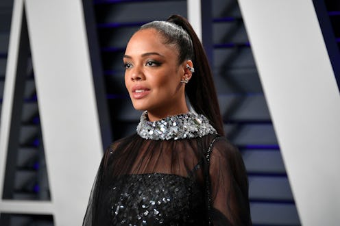 Tessa Thompson continued her marathon as a beauty tastemaker in London on Sun., promoting her forthcoming film, Men In Black: International, alongside co-star Chris Hemsworth. The latest aspirational hairstyle in the actor's growing beauty arsenal? Tessa Thompson's futuristic space buns, courtesy of celebrity hairstylist Lacey Redway. The asymmetrical look put a new-age spin on the '90s-inspired hair trend, further proving the BlacKkKlansman star's ability to serve sophistication alongside even the most eccentric hairstyles.