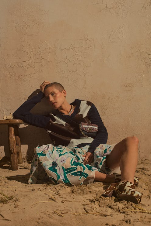 By the seventeenth look, where cow print shoes are styled with a cow print bag and jacket, the pattern is undeniable. A quote from Tory Burch included in the look book sheds light onto the collection's backstory and the print itself. "Pre-Fall 2019 is inspired by artist Georgia O’Keeffe — the way she lived her life and how she interpreted the American Southwest. Saturated colors and textured finishes are influenced by the landscapes O’Keeffe saw and painted," Burch said.