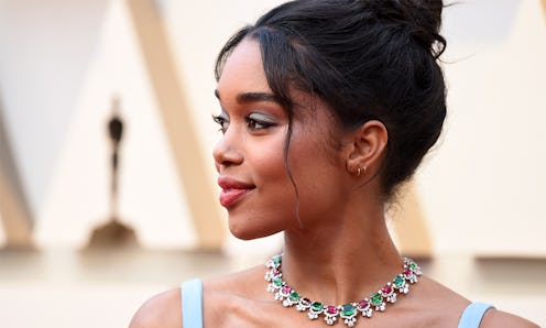 Laura Harrier walked the Oscars red carpet with powder-blue lids that perfectly coordinated with her gown.