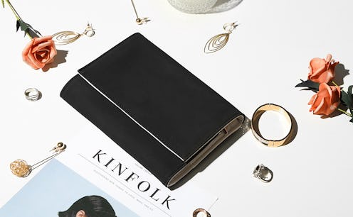 Next time you're traveling, keep your earrings, bracelets, necklaces, and rings neat and accessible with this compact, foldable jewelry organizer. Made of soft, buttery leather and suede, it has a hook, hole, pocket, or compartment to hold just about any type of jewelry. When folded up, it looks like a chic clutch. Get it in black or light grey.